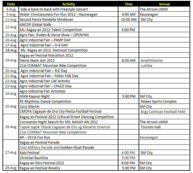 Don’t miss out the core events this year namely Ms. Kagay-an 2012, Agro Fair, Rodeo and Horse Show, Kagay-an 2012 Cultural Street Dancing Competition, the Kagay-an P.E. Rhythmic Dance, Kagay-an Festival Parade (Civic-Military and Golden Float parade), Kagay-an Festival Run and Pyrolympics.